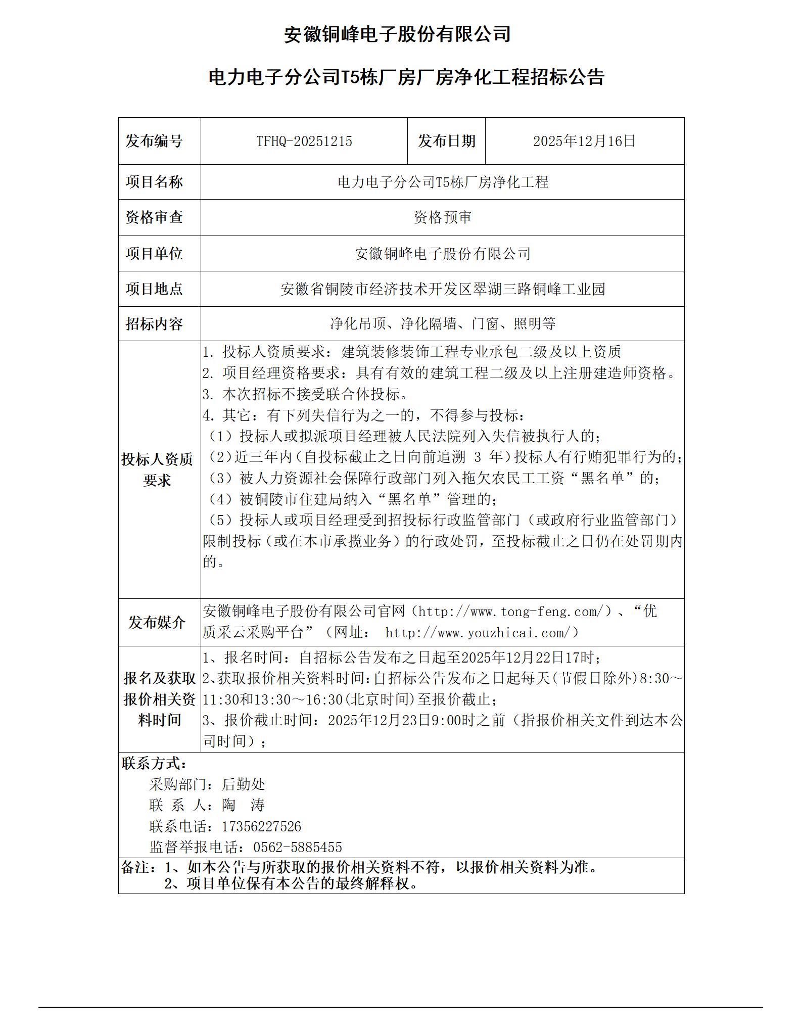 01安徽銅峰電子股份有限公司 (電力電子分公司T5棟廠房?jī)艋こ?招標(biāo)公告)_01