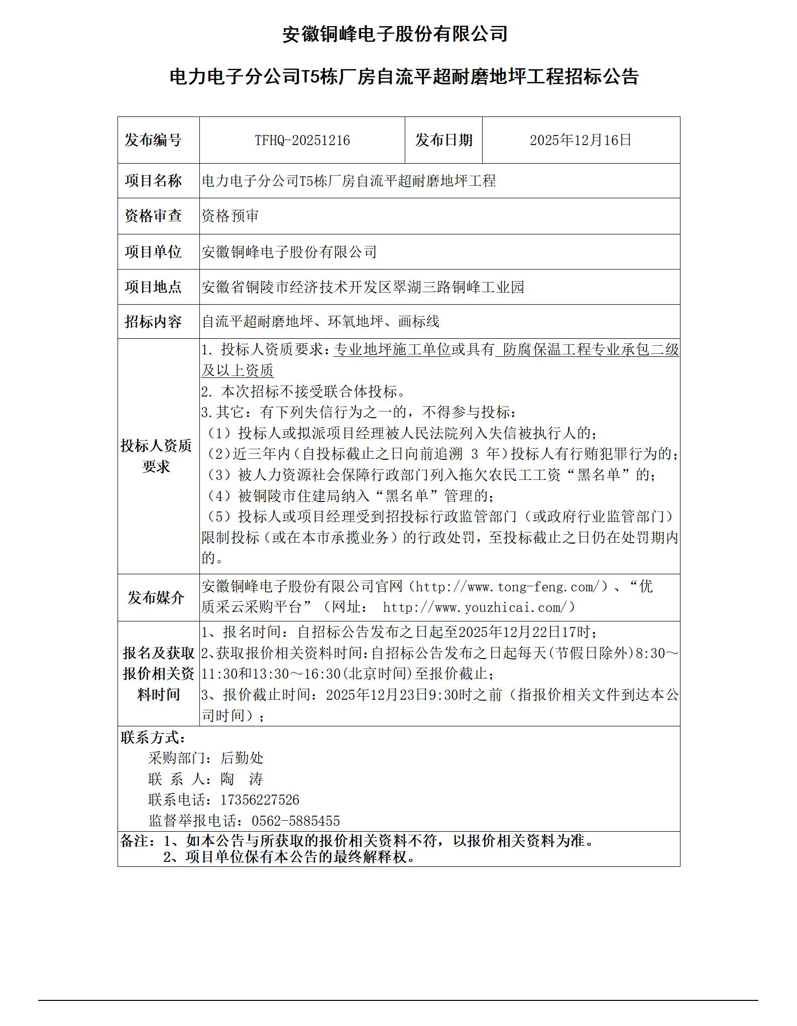 01安徽銅峰電子股份有限公司 (電力電子分公司T5棟廠房自流平超耐磨地坪工程 招標(biāo)公告)_01