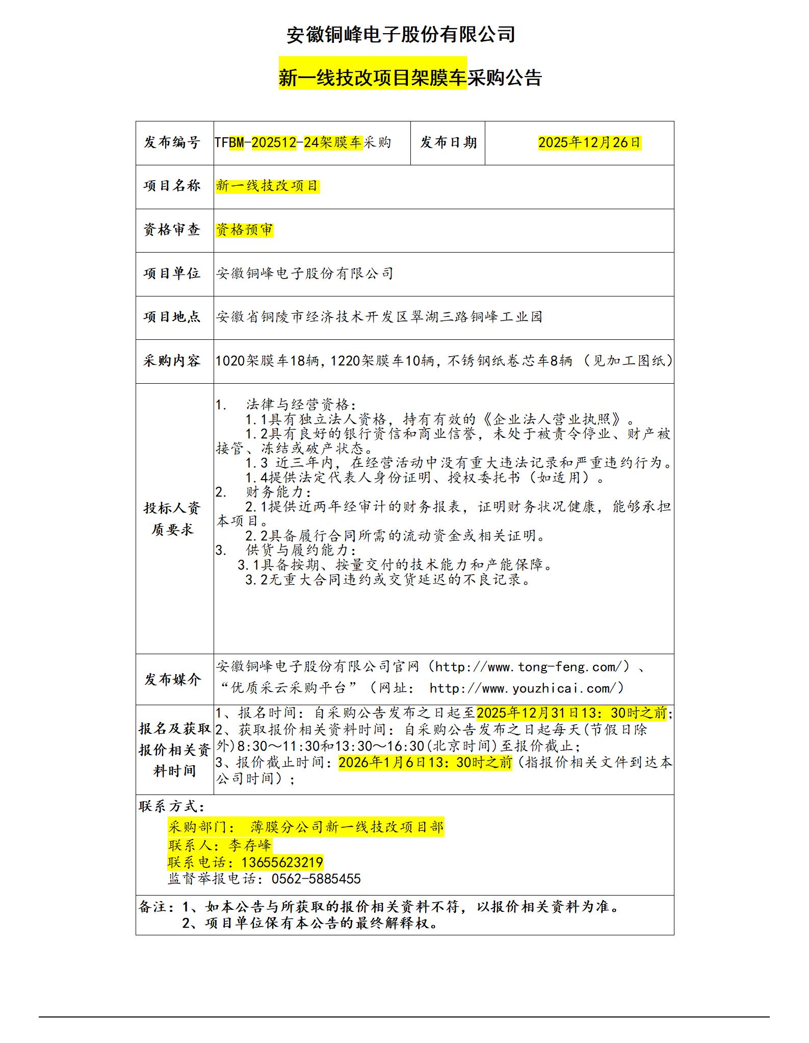 安徽銅峰電子股份有限公司 (新一線架膜車采購招標(biāo)公告)_01