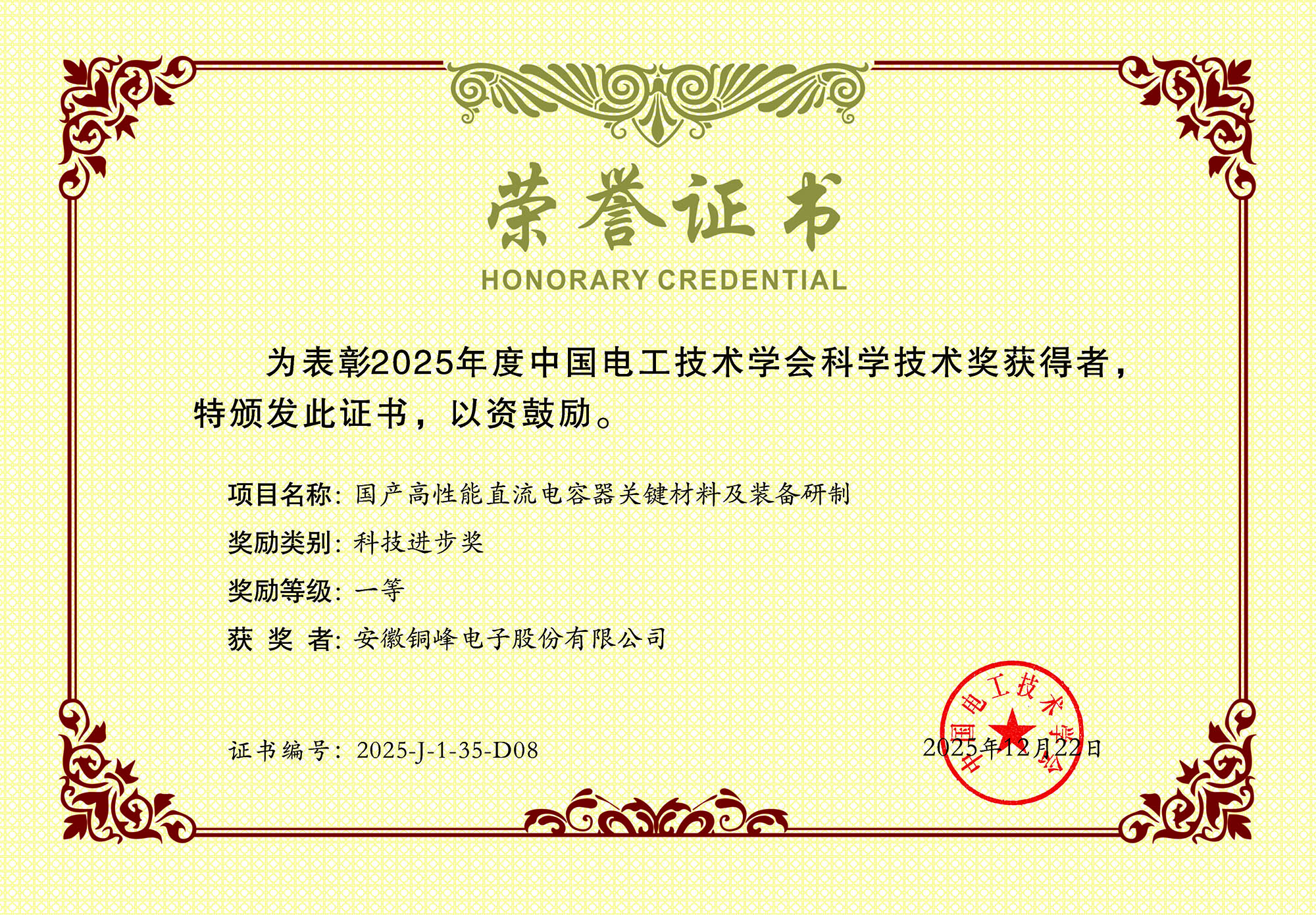 近日,公司參與的合作項目“國產(chǎn)高性能直流電容器關(guān)鍵材料及裝備研制”榮獲2025年度中國電工技術(shù)學會科技進步一等獎。