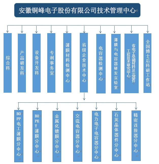 銅峰公司為國家高新技術企業(yè)、國家火炬計劃重點高新技術企業(yè)、國家火炬計劃銅陵電子材料產業(yè)基地重點骨干企業(yè)。公司建有完整的科研創(chuàng)新組織體系,設立技術管理中心作為技術研發(fā)的總管理機構,組織協(xié)調公司的各分子公司和相關部門,以確保公司技術創(chuàng)新精確高效地運行。技術管理中心下設綜合科、產品研發(fā)科、設備開發(fā)科、專利事務室、薄膜材料檢測中心、電容器檢測中心以及薄膜與電容器研發(fā)實驗室,同時下設省級企業(yè)技術中心、安徽省電子基礎材料及元器件工程技術研究中心以及國家級博士后科研工作站。